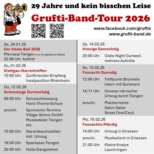 Wir können Ihnen nur empfehlen, sich ein dickes Kreuz in den Kalender zu machen und sich nichts anderes vorzunehmen: Die dritte traditionelle Grufti-Städtle-Fasnacht 2025 steht vor der Tür. Einmal musikalisch durch Tiengen mit spontanen Platzkonzerten überall dort, wo zwei oder drei in unserem Namen zusammen stehen…