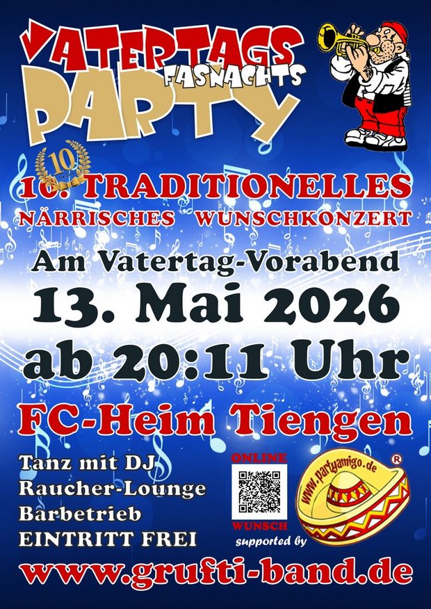 Man mag es kaum glauben - was wir seinerzeit vollmundig gleich bei der ersten Ausgabe als “traditionell” angekündigt hatten, feiert in diesem Jahr doch tatsächlich ein erstes Jubiläum: Die Grufti-Band freut sich auf ihr ZEHNTES traditionelles närrisches Wunschkonzert, welches auch in diesem Jahr am inzwischen angestammten Termin am Vatertags-Vorabend bei unserer Karin im FC-Heim stattfindet.